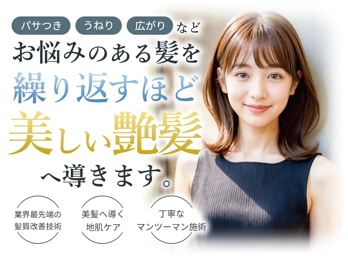 パサつき、広がり、うねりなど、お悩みのある髪をツヤ髪へ導きます。ツヤ髪になる為の方法は髪質や髪の状態によって様々です。最初の一歩はヘアケアのプロによる「髪に今何が必要か」を見極め、美容成分…