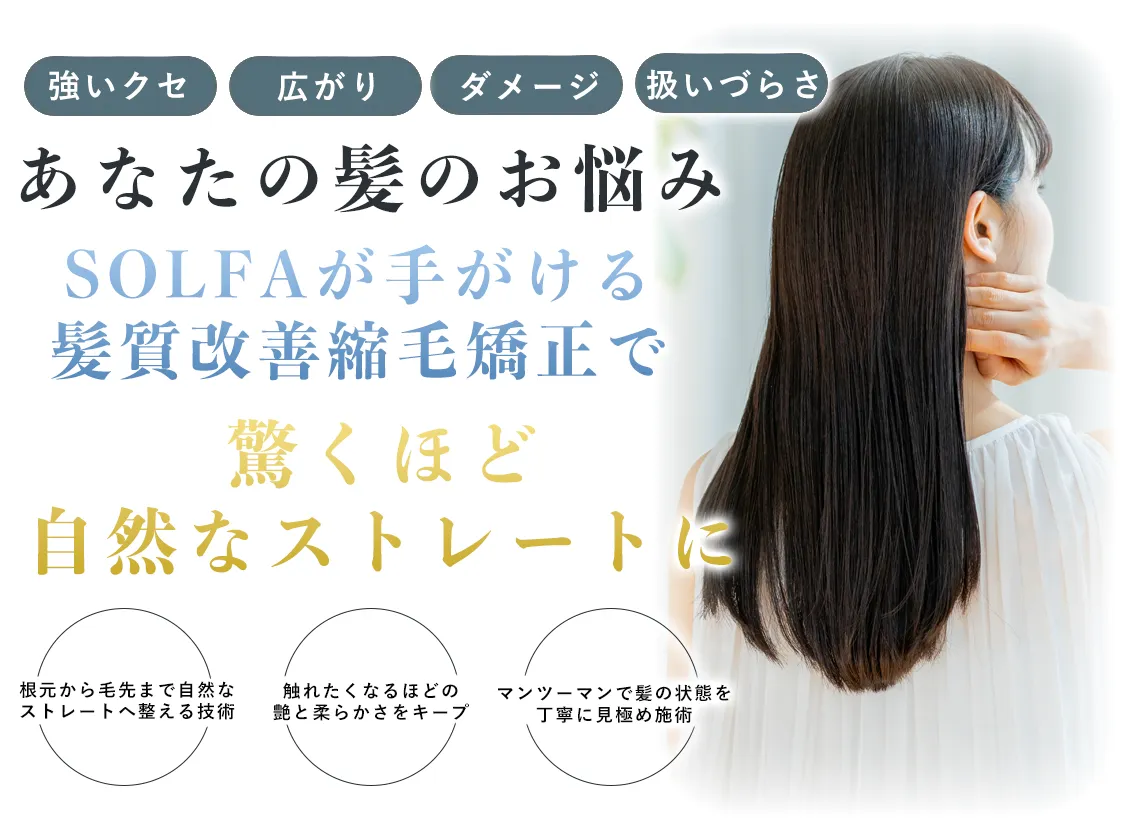 こんにちは。SOLFAです。次元の違う髪の美しさを手に入れたい――そんなお悩みはありませんか。当美容室では、髪本来の美しさを引き出す髪質改善メニューに力を入れています。マンツーマン施術を通じて丁寧…